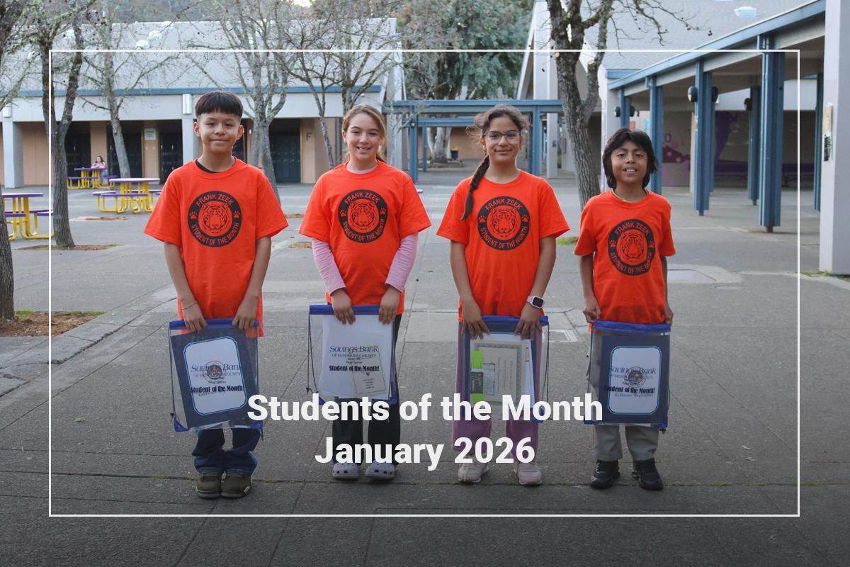 Frank Zeek Elementary recognizes our January Students of the Month: Julian Chavez Gutierrez, Abigail Logan, Madeline Richard, Valentina Contreras Palmerin, and Flavio De Jesus-De Jesus. Strong work, great attitudes, and well-earned recognition — way to shine!